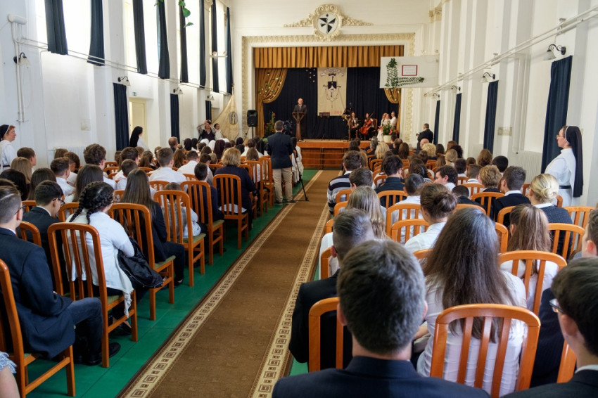 Az ünnepség az iskola dísztermében kezdődött, ahol elsőként Kortis Mónika Zsófia nővér köszöntötte a megjelenteket, köztük Deák Hedvig nővért, az Árpád-házi Szent Margitról Nevezett Domonkosrendi Nővérek Apostoli Kongregációjának főnöknőjét, Zágorhidi Czigány Balázst, a vasvári Domonkos Rendtörténeti Gyűjtemény igazgatóját, a nővéreket, a meghívott vendégeket, valamint az iskola tanárait és diákjait. Zsófia nővér emlékeztetett, 1868-ban érkeztek az első domonkos nővérek Kőszegre, azonban most nemcsak az iskola alapításának 150. évfordulójáról emlékezünk, hanem a rendszerváltás utáni újraindulásának 25. évfordulójára is.