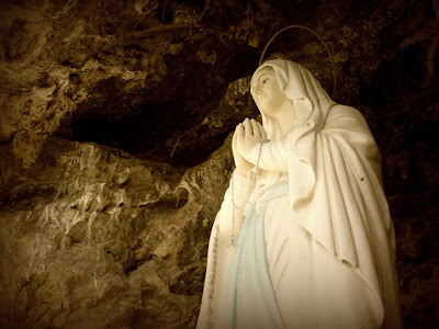 Lourdes-ban egy szegény, tanulatlan 14 éves lánykának, Soubirous Bernadettnek 1858-ban, február 11-én jelent meg először a Szent Szűz, a városka melletti massabielle-i barlangnál. Mária hófehér ruhát viselt, köpenye vakító fehér volt, égszínkék öv volt derekán, mezitelen lábát arany rózsa díszítette. Kezében rózsafüzér volt. Tizennyolc alkalommal jelent meg a kislánynak július 16-ig, bűnbánatot és engesztelést kérve. Március 25-én nevét is elárulta: Én vagyok a Szeplőtelen Fogantatás.
