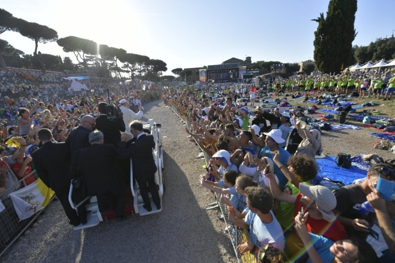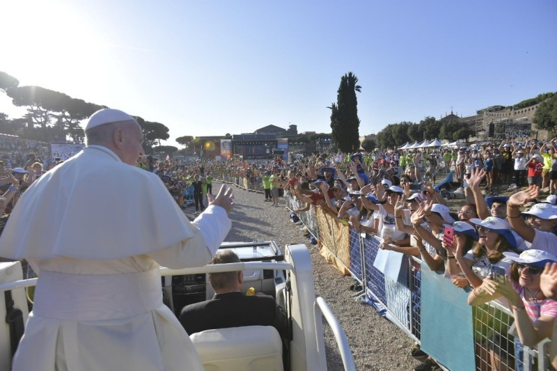 Szép és fáradságos volt Rómába vezető utatok; emlékezzetek csak, mennyi fáradozás kísérte, de mennyi szépség is! Ugyanilyen szép és nehéz lesz a visszautatok is városaitokba, otthonotokba, közösségetekbe. Jánosnak, a „szeretett tanítványnak” a bizalmával és energiájával járjátok végig! Igen, itt van elrejtve az egész titok: abban, hogy általa szeretettek vagyunk, és hogy tudjuk, hogy ő szeret minket, az Úr szeret minket! Valamennyien, amikor most hazaindultok, rejtsétek szívetekbe és véssétek emlékezetetekbe: „Jézus, az Úr szeret engem. Szeretve vagyok. Érzem az engem szerető Jézus gyengédségét.” Bátran és örömmel járjátok végig a haza vezető utat, abban a tudatban, hogy Jézus szeret titeket. És akkor ezzel a szeretettel az élet kellemes futássá válik, szorongás nélkül és félelem nélkül; a félelem az, ami tönkretesz bennünket. Szorongás nélkül és félelem nélkül! Futás Jézus felé és a testvérek felé, szeretettel, hittel és örömmel teli szívvel.