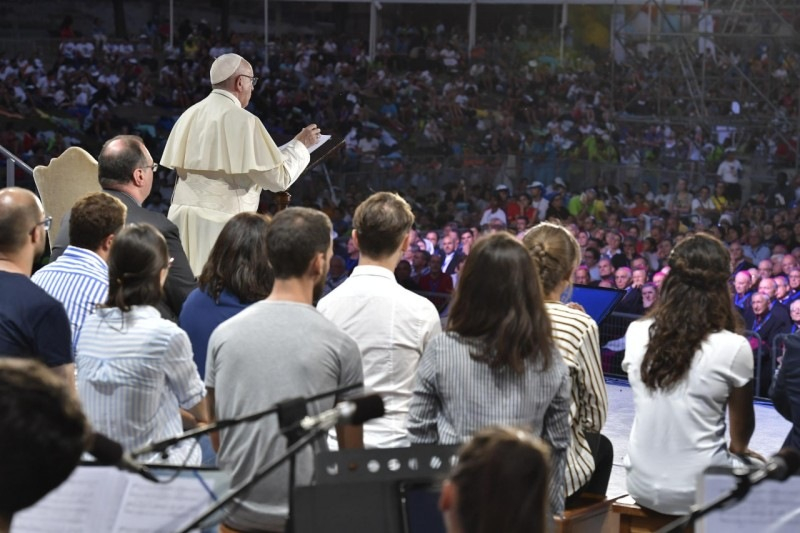 Kedves barátaim, útnak indultatok, és eljöttetek erre a találkozóra. És most az az öröm tölt el engem, hogy érzem: szívetek a Jézus iránti szeretettől dobog, mint Mária Magdolnáé, Péteré és Jánosé. És mivel fiatalok vagytok, én Péterhez hasonlóan örülök, amikor azt látom, hogy gyorsabban futtok, úgy, mint János, szívetek ösztönzését követve, mely fogékony az álmaitokat vezérlő Lélek hangjára. Ezért azt mondom nektek: ne elégedjetek meg a sor végére beálló, megfontolt ember lépésével. Ne elégedjetek meg a sor végére beálló, megfontolt ember lépésével! Bátran meg kell kockáztatni az előrelendülést, a félelem nélküli nekirugaszkodást, hogy merjetek álmodni és megvalósítani, mint Jézus Istennek az országát, és merjetek egy testvériesebb emberiségért dolgozni. Testvériségre van szükségünk: kockáztassatok, menjetek előre!