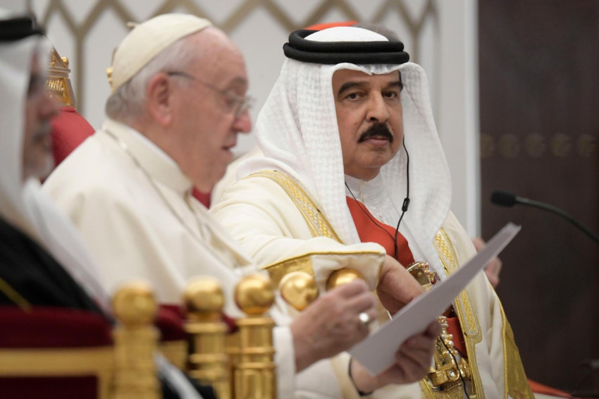 – figyelmeztetett a pápa. Apostoli látogatásához fűződő reményeit egy a Bahreini Királyság nyilatkozatából vett részlettel fogalmazta meg: „Elkötelezzük magunkat, hogy egy olyan világért tevékenykedünk, amelyben az őszinte hitű emberek összefognak, hogy elutasítsuk azt, ami elválaszt bennünket, és ehelyett arra összpontosítunk, hogy ünnepeljük és kiterjesszük azt, ami összeköt minket.”