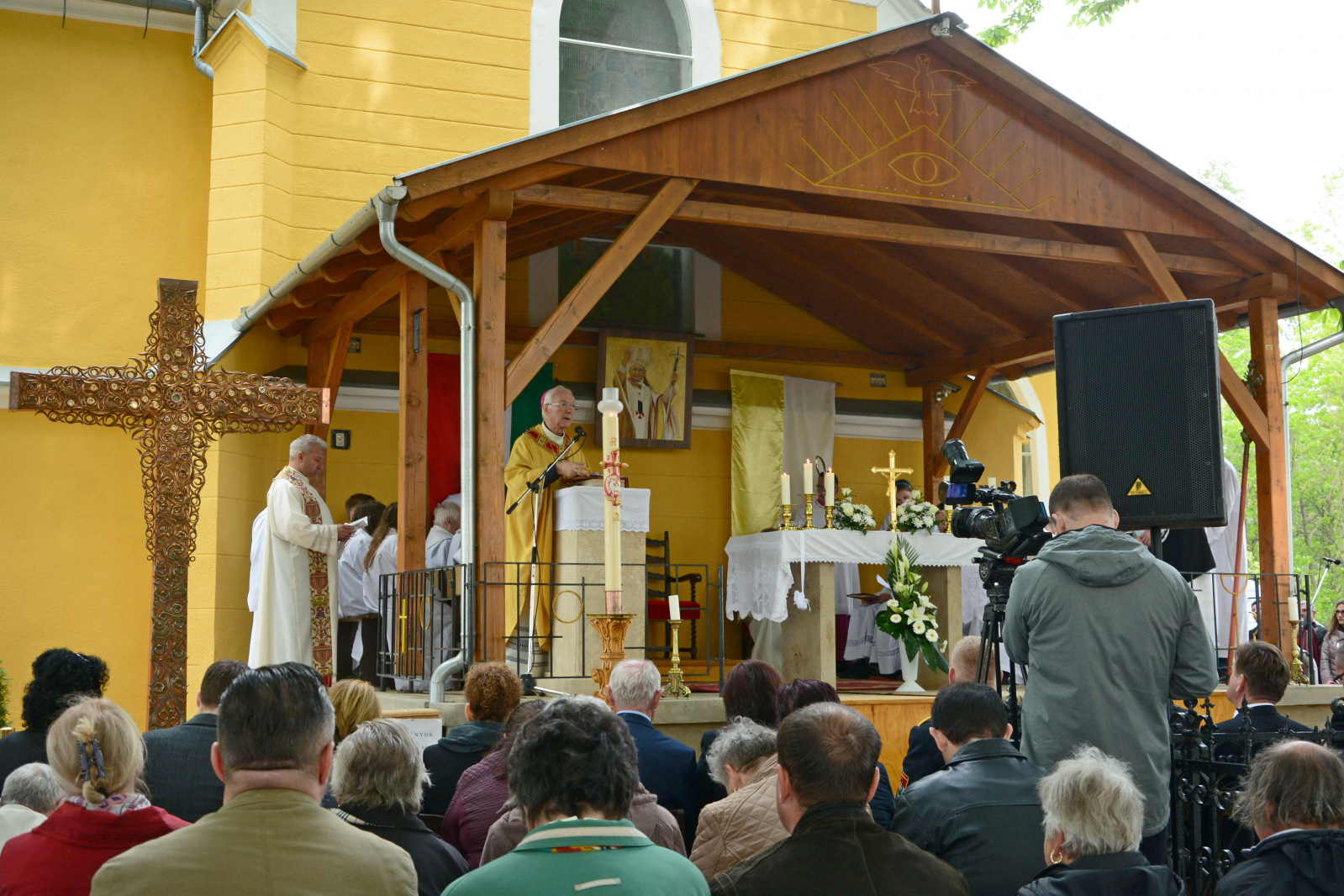 A lengyelországi Wadowicében pontosan 99 évvel ezelőtt, 1920. május 18-án született meg Karol Wojtyła, aki 58 évvel később II. János Pál néven lépett az Egyház élére. Ha még itt, e földi életben élne, azt mondanánk, ma belépett a 100. évébe. Ezt a születésnapot is ünnepeltük a szanyi búcsújáróhelyen, ebben a fagyosszentek uralta májusban, amely ezen a szombaton mégis mosolygósabb, napfényes arcát mutatta a magas fák alatt megbújó kis kápolna körül összegyűlteknek. A kápolna oldalában, a szabadtéri oltár mellett állították fel a missziós keresztet, az oltár fölött elhelyezett képről pedig a szent pápa tekintett ránk.
