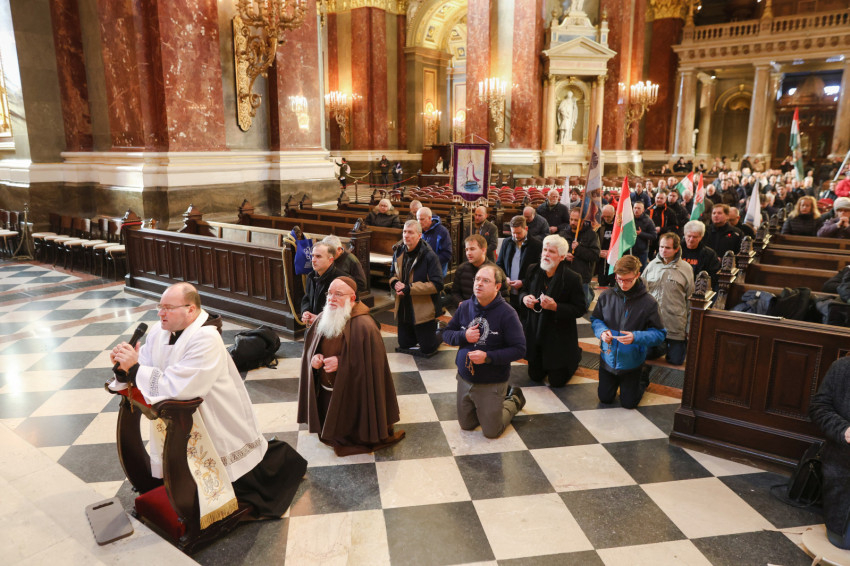 Keserű Balázs az elsőszombati engesztelés összefoglalását adta, melyet Ciprián kapucinus atya elmélkedése követett. A legszentebb Oltáriszentség előtt következett a férfiak TÉRdeplő imája, majd az egyéni áldás. Az alkalmat közös éneklés és csoportkép készítése zárta a Szent Jobbnál, a Szent István-bazilika oltárképe alatt, ahol Szent István felajánlja a Szent Koronát Szűz Máriának.